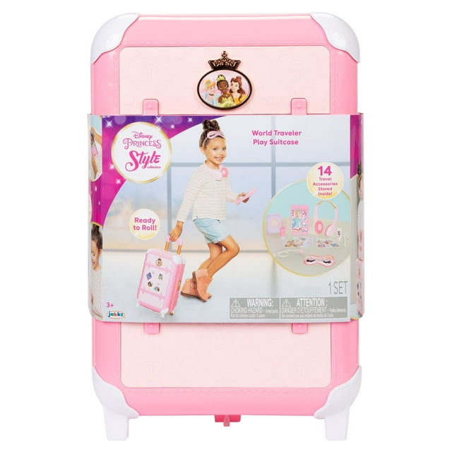 Sleek unique and oh so fun, the Disney Princess Style Collection combines everyday play with a contemporary Disney Princess flair. This collection of real-life inspired toys is meant for the modern girl with big goals and great style. She's a go-getter, a globe-trotter, a fashionista, and most of all, a girl who sets her own trends! Get ready to take on the world with the Disney Princess Style Collection! The Disney Princess Style Collection Play Suitcase has everything a princess needs to travel in style! All your travel essentials are covered, and they are stored perfectly in the oh-so-chic play suitcase. Lounge at the airport with play ear buds and eye mask, or freshen up before take-off with the play lip balm and hand sanitizer. The real working wheels and retractable handle make sure you always catch your flight! With a passport and ticket in your folio, you're set to jet to adventures in faraway places!
