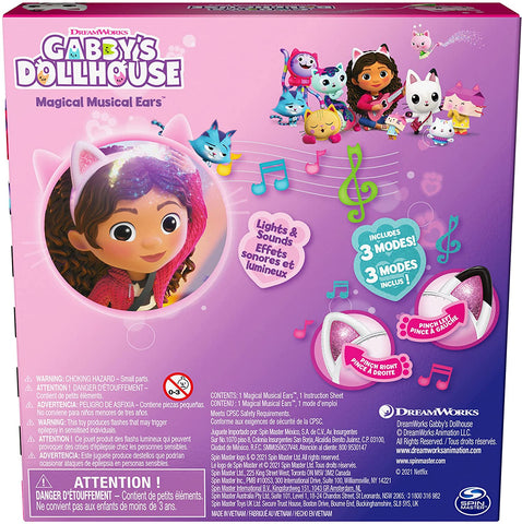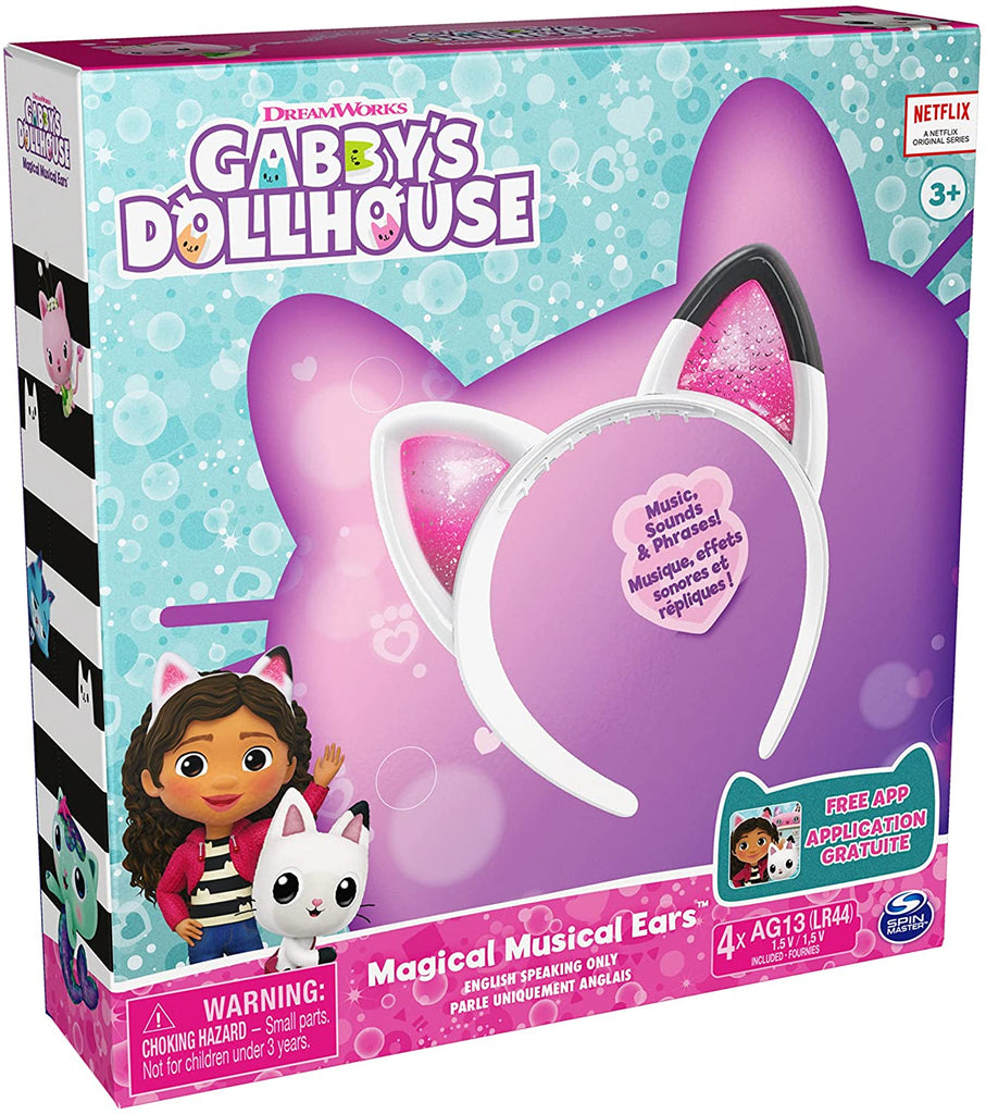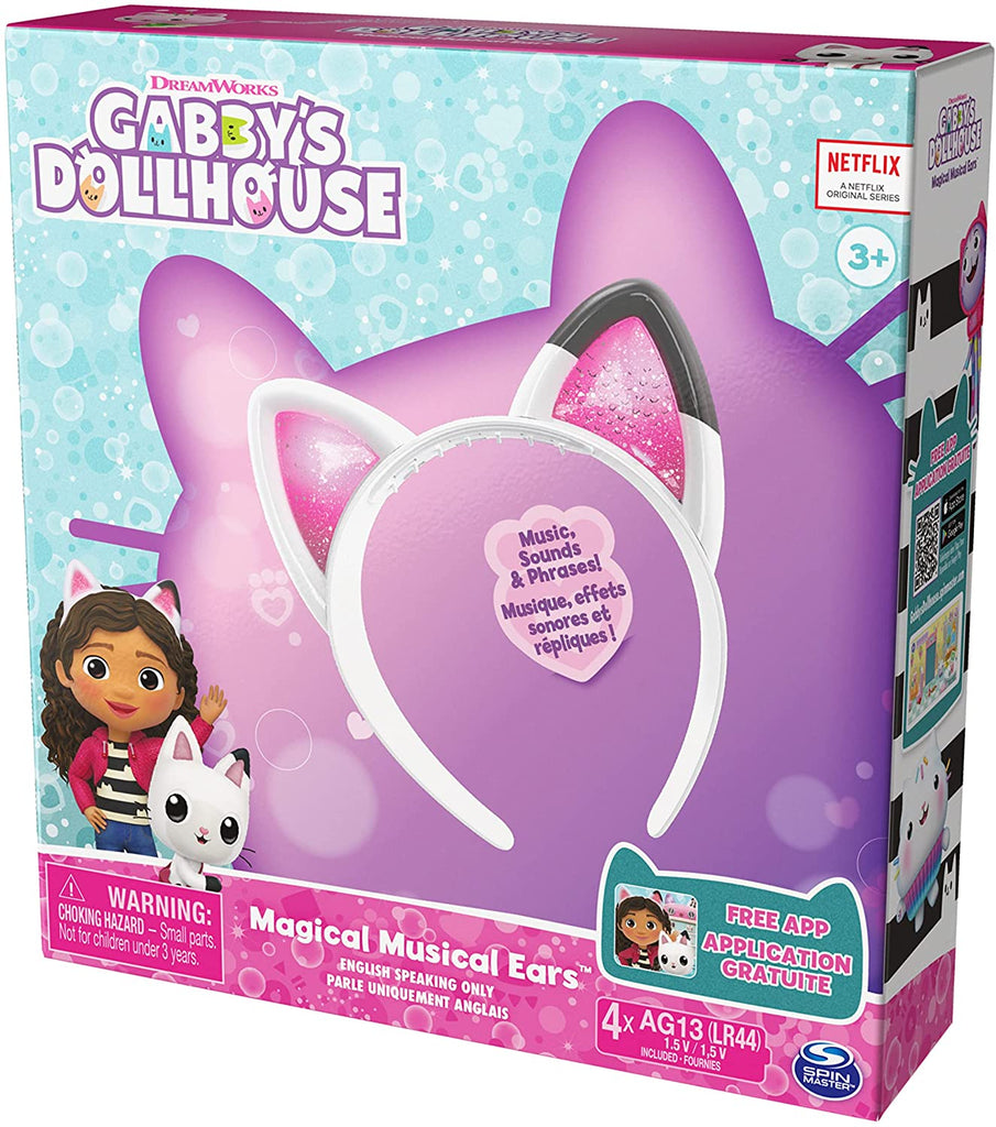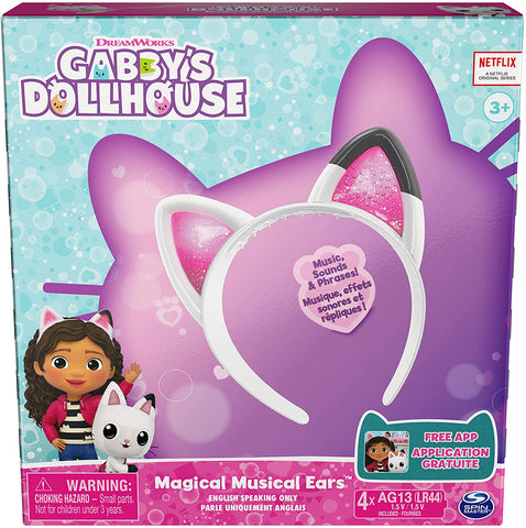 Dress up as Gabby from Gabby’s Dollhouse with the Magical Musical Ears! These interactive cat ears look just like the ones Gabby wears in the show. Slide the Magical Musical Ears on and get ready for adventure! Featuring lights and over 10 sounds, phrases and songs, you’ll have endless amounts of fun! Simply press one of the pink sparkly ears to turn them on, then pinch the left ear to hear phrases from Gabby. To activate sound effects and songs from the show, pinch the right ear and have a dance party as the music plays! Enter Meow Mode by pressing both ears at the same time for pulsating lights and cat-tastic meows! The Magical Musical Ears are the perfect accessory to bring the memorable shrink-me moment from the show to life. Wearing your own pair of cat ears, you’ll feel just like Gabby! Use your imagination to create and play out your adventures as Gabby with the Gabby’s Dollhouse Magical Musical Ears!