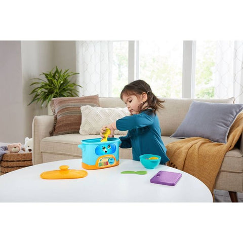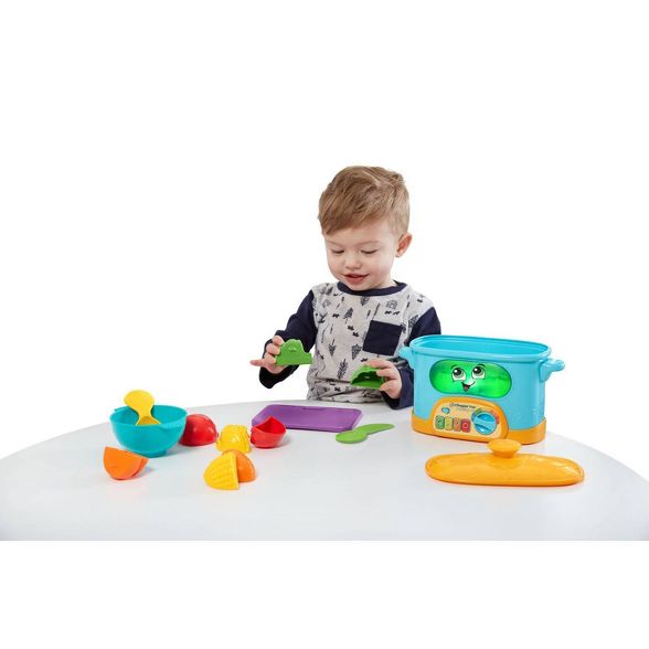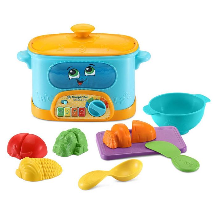 Prepare a recipe for learning with the Choppin’ Fun Learning Pot™! Children love to pretend to cook. Prepare broccoli, corn, a tomato and a carrot with snap-apart veggies, a play knife and cutting board. Hear the pot respond with encouraging phrases as kids add veggies to the pot. Let’s make spaghetti sauce! Follow five step-by-step recipes to encourage learning with play. Chop the food and set the temperature dial. Now press a food button and stir the pot to make spaghetti sauce, rainbow soup, corn on the cob, carrot soup and broccoli with cheese! Watch the pot “boil” with pretend water in the front panel. Hear the pot count to 10 and talk about colors as you play. Serve up your creation in the bowl, pick up the spoon, and dig in! All the pieces store in or on the pot for easy cleanup when playtime is done. Soup-tastic! Intended for ages 12+ months. Requires 2 AA batteries. Batteries included for demo purposes only. New batteries recommended for regular use.