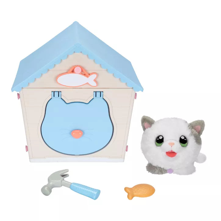 My Kitty's Home comes as a flat pack with all the tools and parts needed to build a little home for your kitty. After the walls and roof are put together, it's time to add the final touch by picking a name for your kitty and attaching their name plate to the front of the house. Now it's time for the real surprise to happen - what's that sound coming from inside? Open the door! Wow! An adorable kitty has appeared! Which kitty will you find? Will they have blue or green eyes? This sweet little kitty is so playful and interactive with more than 25 sounds and reactions. They even come with a fish biscuit toy for kitty to play and interact with! Kitty is electronic and reacts to touch just like a real pet. My Kitty's Home even comes with an adoption certificate that can be filled in. Repeat the magical arrival again and again. Part construction toy, part surprise unboxing and part cuddly interactive plush, kids will love My Kitty's Home as they prepare the perfect home for a kitty to call their own.