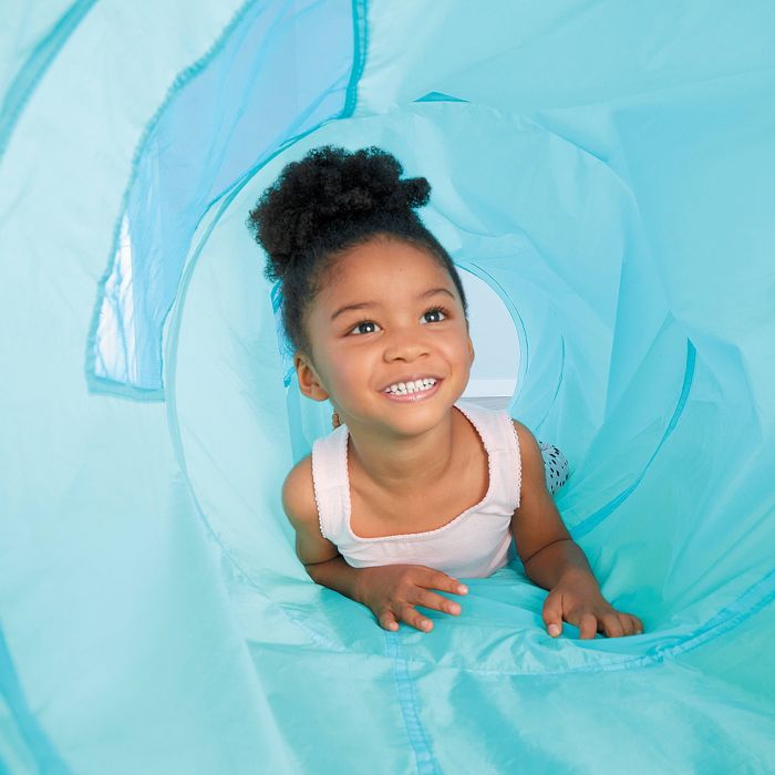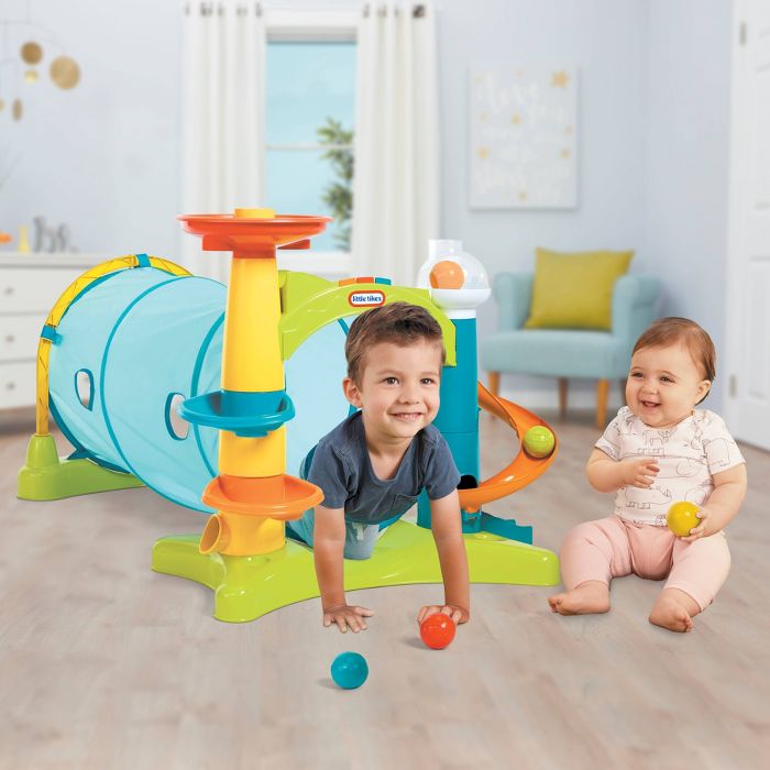 Explore and grow with the Little Tikes® 2-in-1 Activity Tunnel. Featuring 2 ways to play, this tunnel will get kids crawling and engaging in ball play. Crawl through the tunnel and play peekaboo through the side windows. The activity center features two ball drop towers where kids can drop colorful balls and delight in where they roll! The tunnel even plays silly sounds and music. The durable, flexible-fabric tunnel can be moved in different ways, and it collapses for easy storage. The 2-in-1 Activity Tunnel encourages crawling, reaching, grasping, and color recognition. It includes five plastic balls to get the good times rolling. Recommended for ages 1 – 3 years.