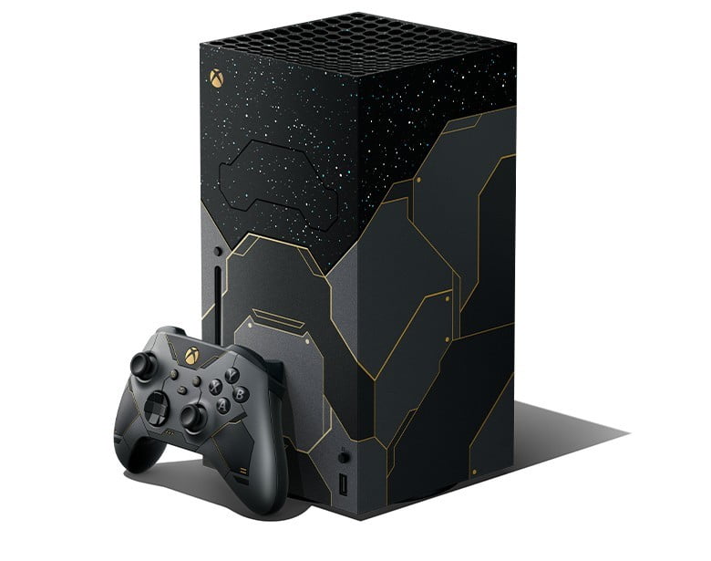 • Includes a custom console design imprinted with stars as seen from the surface of Zeta Halo—extending onto the fan behind a Cortana blue vent. Inspired by the Master Chief’s armor, dark metallic paneling is accented by iridium gold on the console and its matching controller with side and back grips to accommodate all play styles.