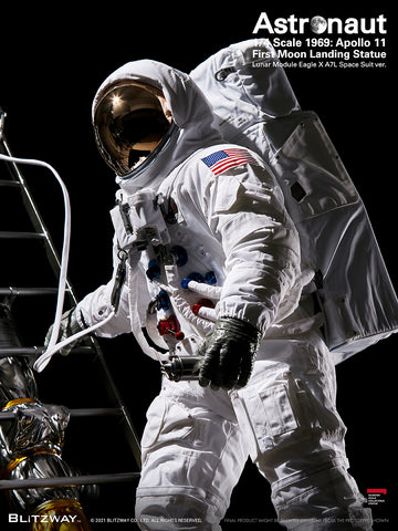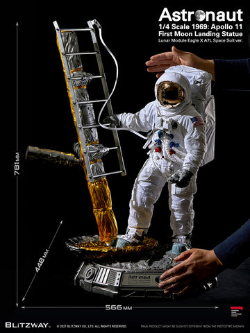 In August 1969, more than half a billion people worldwide watched on their televisions, and now Blitzway brings this unforgettable moment to a vivid piece of art. The 1/4 scale astronaut's posture and safety belt along with realistic props used for the lunar mission add realism to this statue. The supporting structure rising over the helmet will make you imagine the scale of the lunar module. The designed base reconstructed from the motifs of the spaceship shows respect for this great achievement.