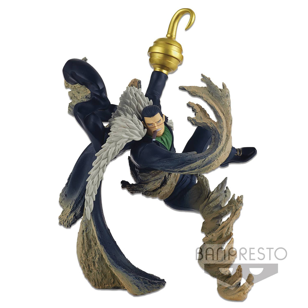 From Banpresto. From the hit anime series, One Piece, Crocodile moves for the final blow! The ferocious fighter's ability to control sand is perfectly captured in this new figure by Banpresto! Standing at 5.5" tall, this figure is designed so elements of the action keep Crocodile in suspended mid action battle!