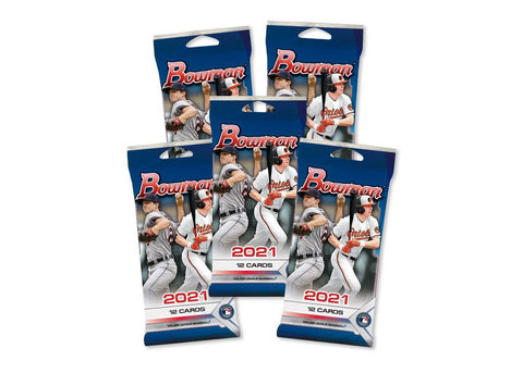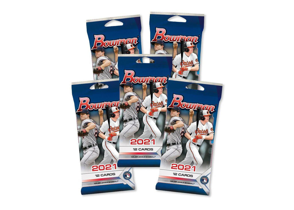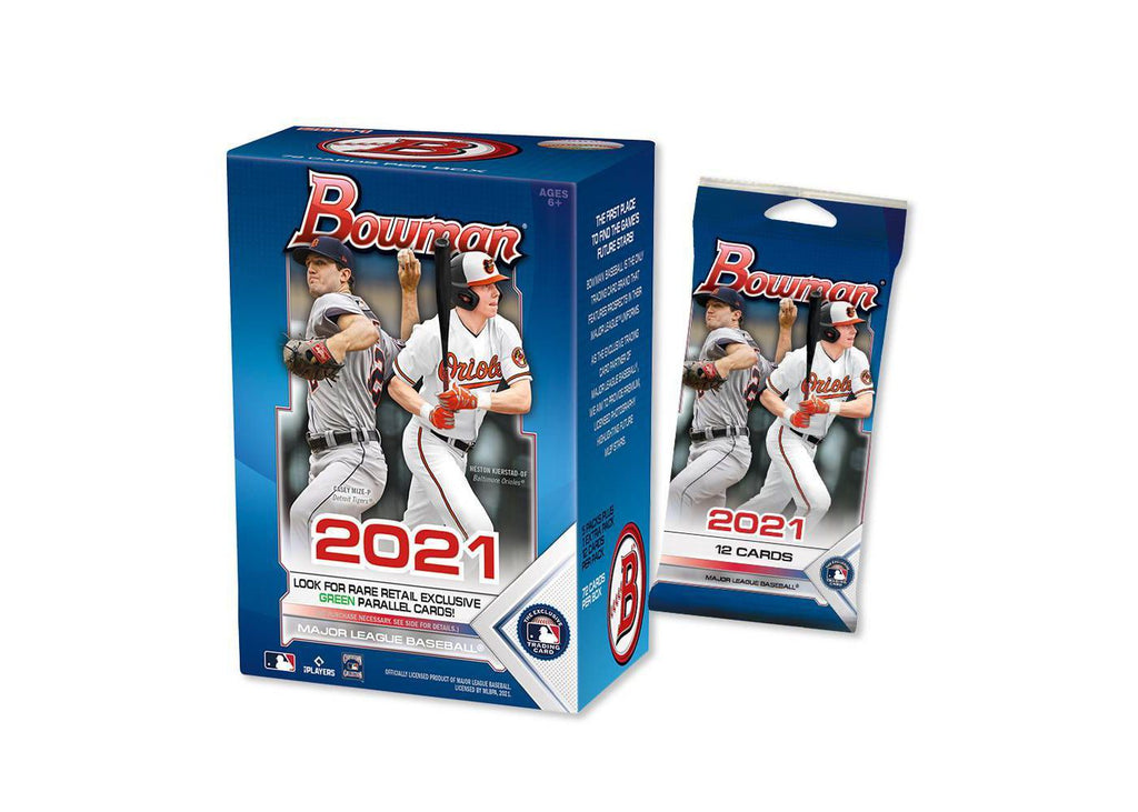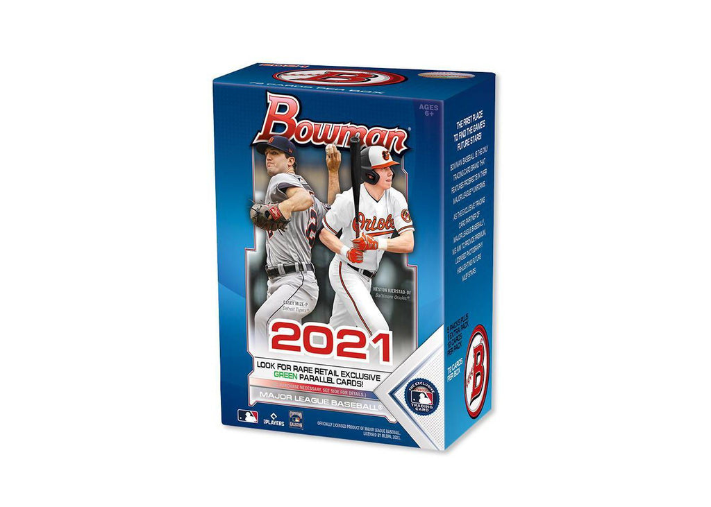 Topps presents the 2021 MLB Bowman full box! Each box contains 5 packs and 1 bonus pack, and each pack contains 12 MLB trading cards. Be on the lookout for rare retail-exclusive Green Parallel cards!