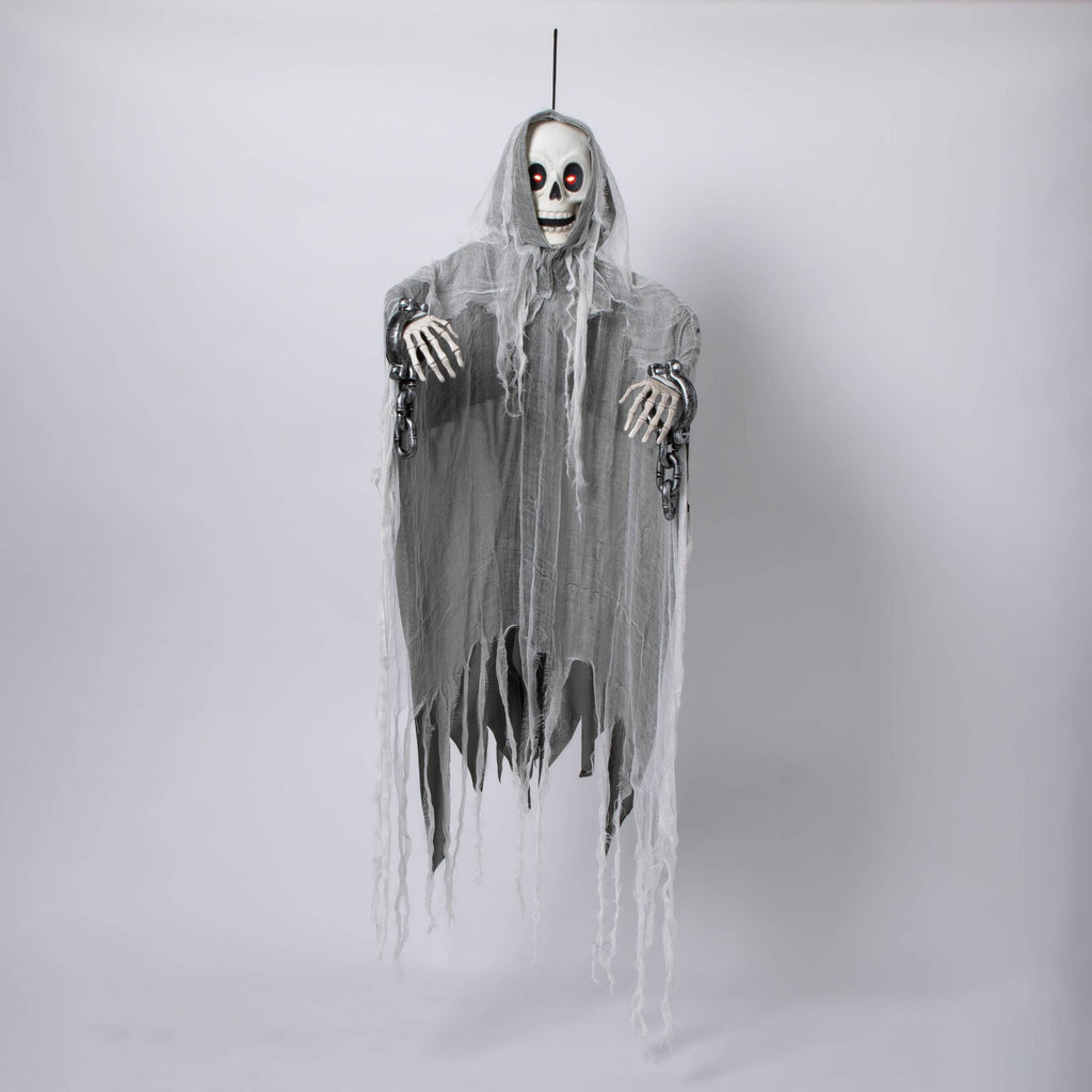 This Animated Reaper Skeleton with Chains Halloween Decorative Mannequin from Hyde & EEK! Boutique will draw a satisfying spook out of anyone with a taste for horrifying Halloween decor. Hang this spine-chilling spirit on a tree branch to watch its tattered cloak and chained wrists eerily sway in the wind. Beaming red lights function as its pupils. At night, they glare at passersby with a stare that's sure to scare!