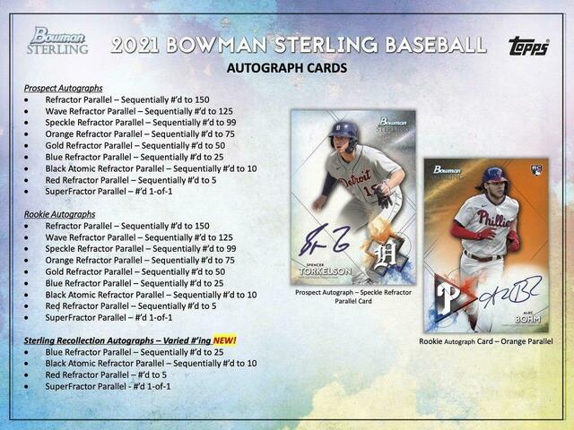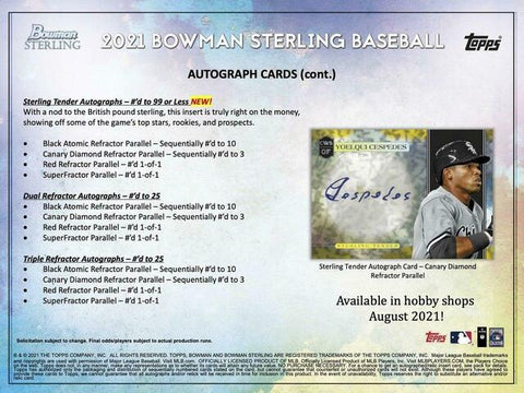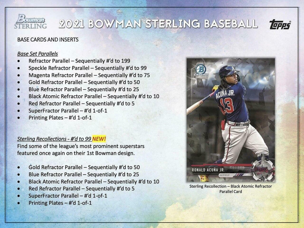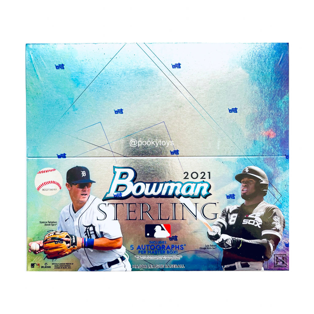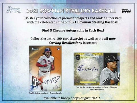 From Topps Company. Bolster your collection of premier prospects and rookie superstars with the celebrated shine of 2021 Bowman Sterling Baseball. Find 5 Chrome Autographs in Each Box! Collect the entire 100-card Base Set as well as the all-new Sterling Recollections insert set.