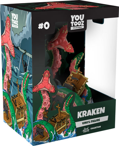 This incredibly detailed designer art figure stands 4.5" tall and captures the heart stopping moment a Kraken rises from below, using its tentacles to squeeze and breach the hull! The base is a blue sea, with waves modeled mid splash, and in the center we see a half sunken ship, sporting a black Youtooz sail. With a green exterior, detailed pink suction cups and sharp teeth, be extra careful with the Kraken on your desk. The window box of the figure was illustrated to capture a gloomy storm at sea. This collectible ships in a matte, embossed, protective outer sleeve.