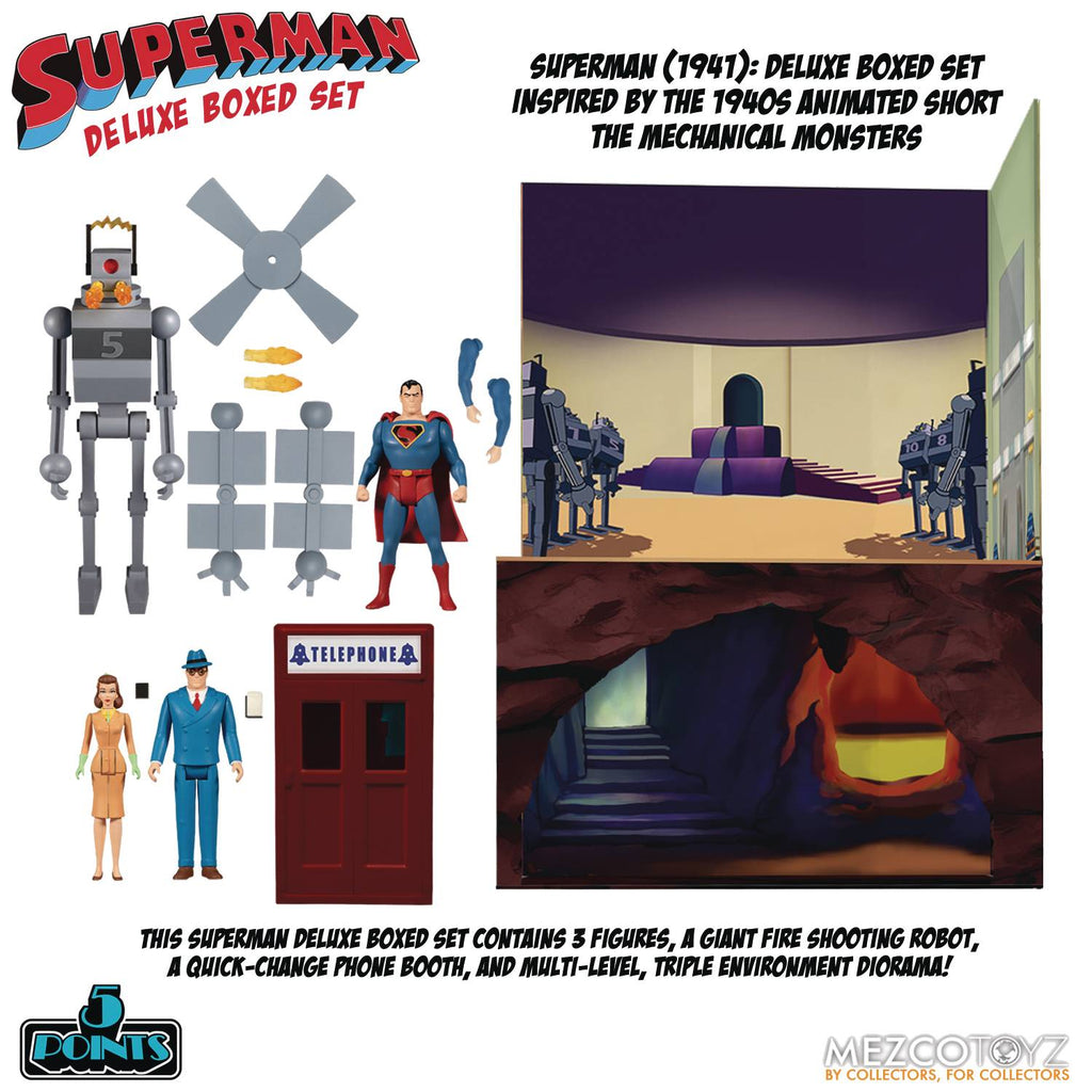 Up in the sky, look: it's a bird. It's a plane. It's Superman! 5 Points present - Superman (1941): Deluxe Boxed Set, inspired by the 1940s animated short The Mechanical Monsters. Faster than a speeding bullet, more powerful than a locomotive, able to leap tall buildings in a single bound - this Superman deluxe boxed set contains 3 figures, a giant fire shooting robot, a quick-change phone booth, and multi-level, triple environment diorama!
