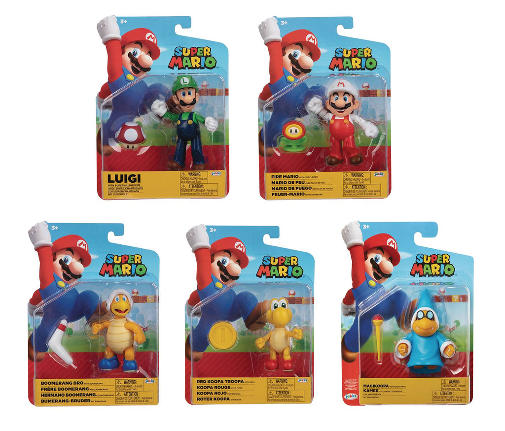 From Jakks Pacific. Visit the world of Nintendo with Jakks Pacific's newest 4" figures! Each character comes with a bonus accessory and multiple points of articulation. Figures include Magikoopa, Boomerang Joe, Fire Mario, Luigi, and Red Koopa Troopa!