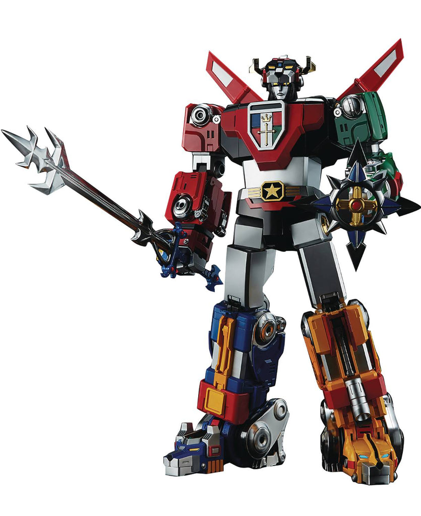 From Blitzway. Introducing the Voltron, a new CARBOTIX figure from Blitzway! Blitzway carefully analyzed the five lions and used free-moving joints that can reproduce their dynamic poses in the animation while maintaining perfect proportions in both their lion states, and when they are combined to form the impressive 15" tall Voltron! Like other transforming robot series, alloy parts have been used in the right places to give the satisfying feeling of holding a heavy robot, and each lion's eyes have an LED light for an animated appearance. The included action base enables you to display each lion as if they are floating in the air using a support shaped as a trajectory of light representing each lion. This support can also be used to mount weapons when combined into the form of Voltron. Also included are: five figurines of standing Voltron's pilots, one replaceable roaring face, and nineteen various Voltron weapons. Prototype shown, final product may be slightly different.