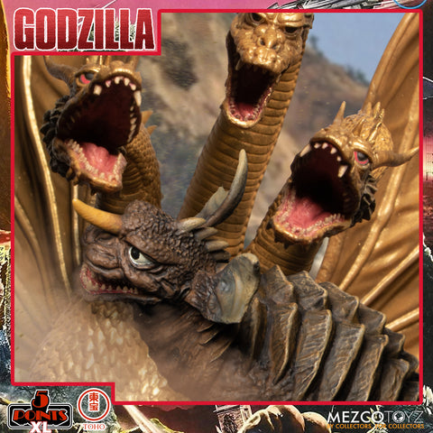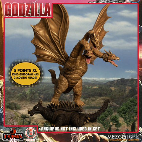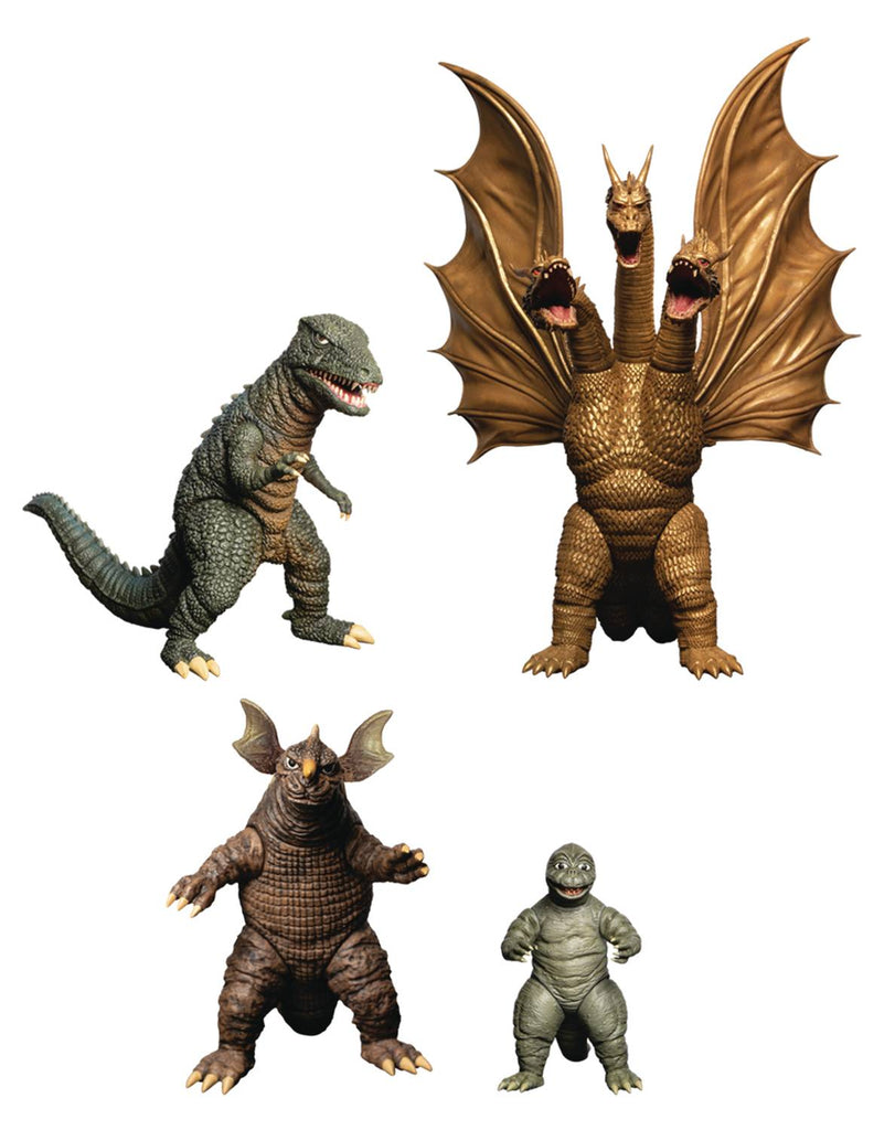 Inspired by the 1968 film, this second bursting box of behemoths contains King Ghidorah, Manilla, Gorosaurus, and Baragon! The 5 Points Xl Destroy All Monsters (1968): Round 2 Set includes: King Ghidorah with three gravity beam FX that can attach to his three head portraits; Minilla with alternate arms, an alternate head portrait, and his signature atomic smoke ring FX; Gorosaurus; and Baragon with an alternate head portrait and an alternate pair of legs.