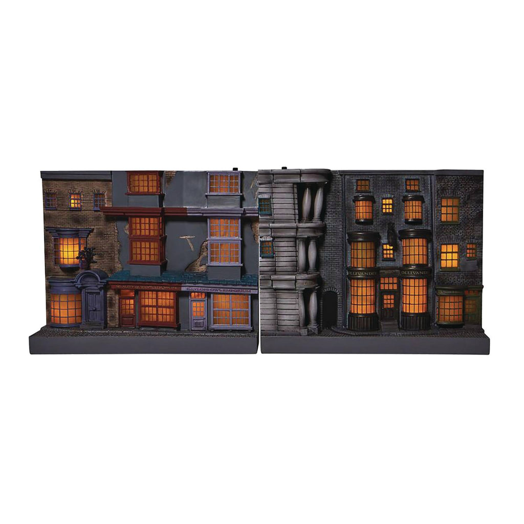 From Enesco. The zany, beautiful, mysterious buildings of Diagon Alley have been sculpted in great detail, with lighting in the windows of these amazing bookends. Each bookend shows off details from different sections of the alley, including the storefront of Ollivander's Wand Shop. Bookends measure 7" tall by 7.5" deep.